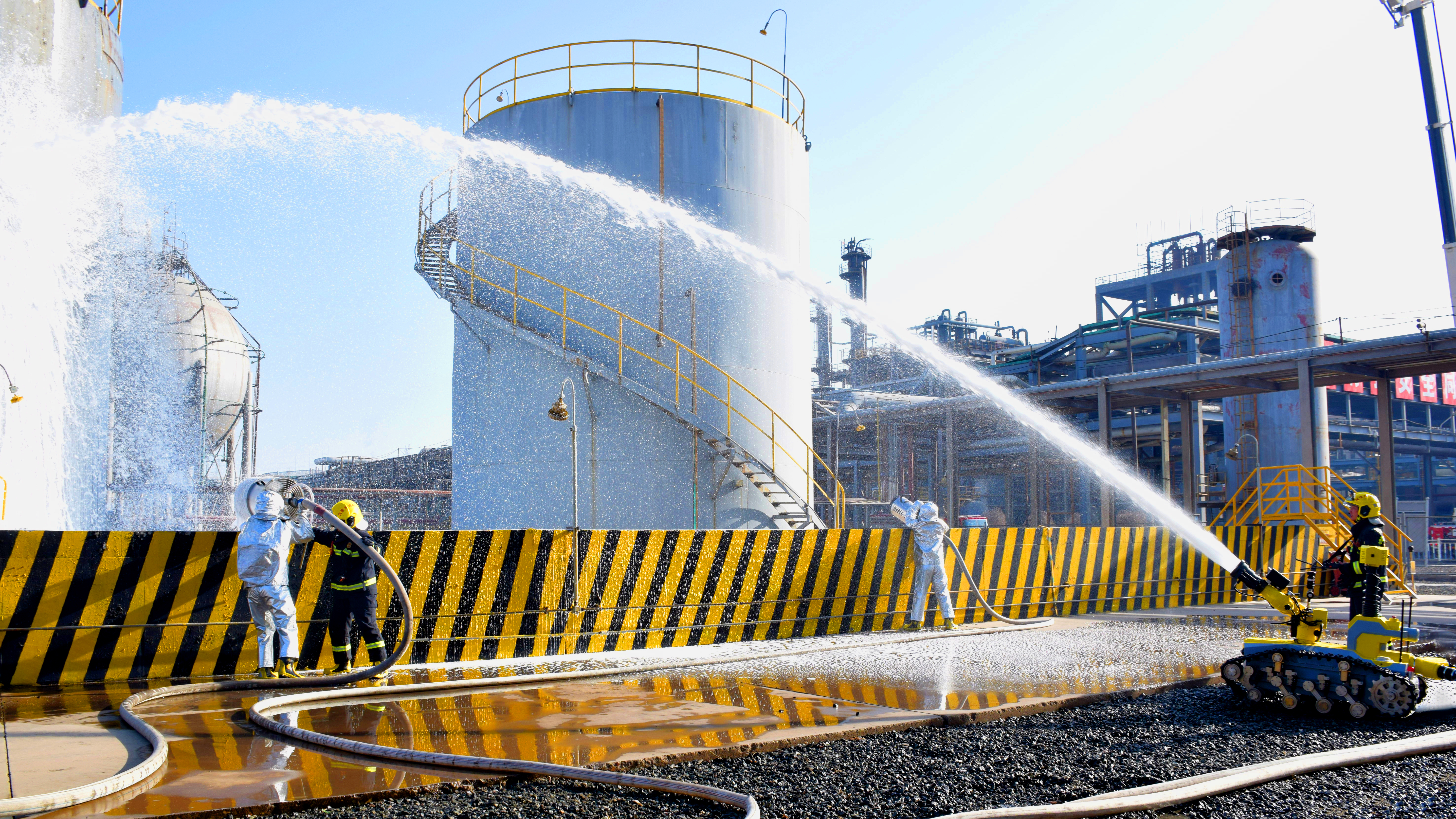 此次演练模拟公司二级重大危险源——氯乙烯庚烷储罐发生严重泄漏事故。演练正式开始后,现场人员迅速采取工艺处置措施,有效控制事态发展,各救援小组第一时间赶赴现场展开应急处置。演练过程中,公司应急小组与消防救援支队分工明确、配合默契、操作规范。依托消防履带机器人、消防炮、高喷消防车、消防泡沫等专业装备,演练人员高效完成泄漏封堵与火情压制,演练取得圆满成功。